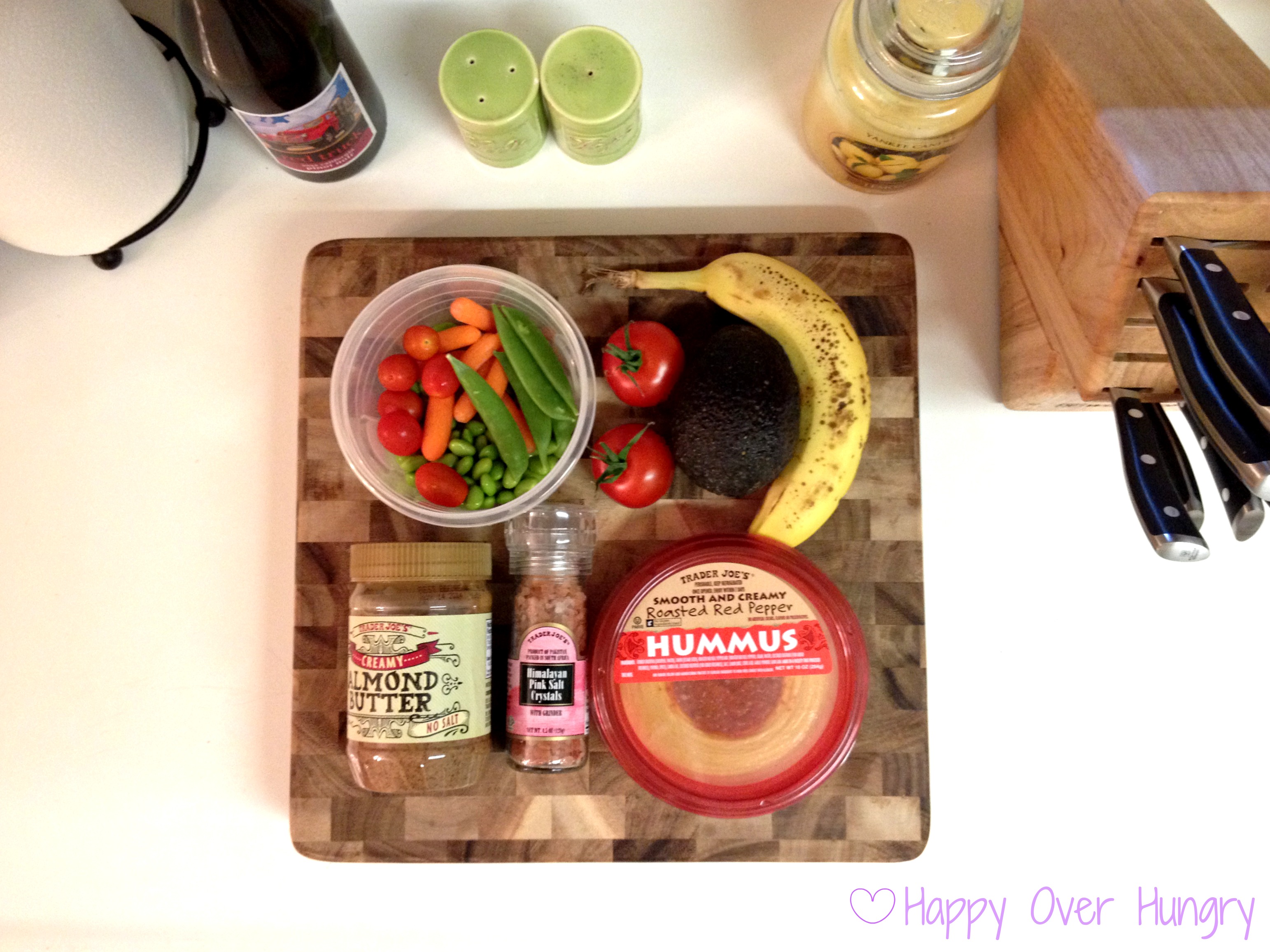 This yummy assortment will turn into: veggie bites with hummus; bananas and apples (missing…left at work, oops!) with almond butter; a slice of toast (Ezekial bread) with avocado and sliced tomato; and this “Easy Ass But Not So Pretty Vegan Quinoa Salad” by The Skinny Confidential (we’ll see if I can recreate it. Not pictured: quinoa, plain hummus, chili flakes, lemon and pomegranate seeds).